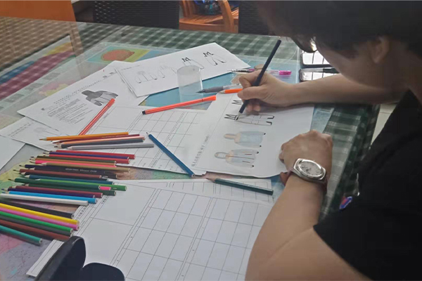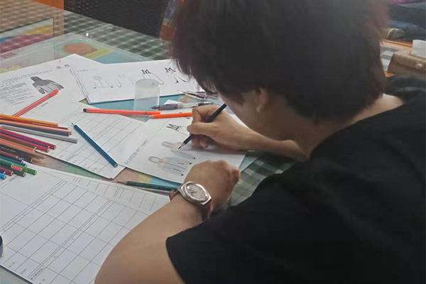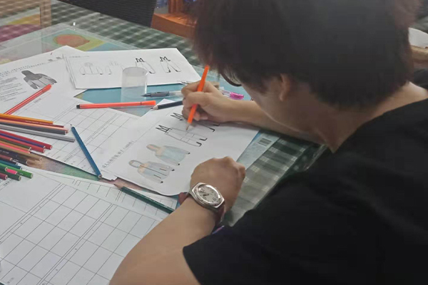 盡管困難重重,我們也要想進一切辦法做到,不僅要做好,而且要做到最好!我們的總經理自己也搖身一變設計師——畫稿,可以看到以下的圖片,認真、負責的態(tài)度,用心的為客戶所思,一筆一筆的畫好,一點點的涂好顏色;還有一個紙樣哥哥也在幫忙畫,他們兩個人在一兩天的時間內要畫好接近10個款衣服和褲子,雖然我們的時間不多,但是睿牛的小伙伴們也是很努力的去做,努力過就不曾后悔。